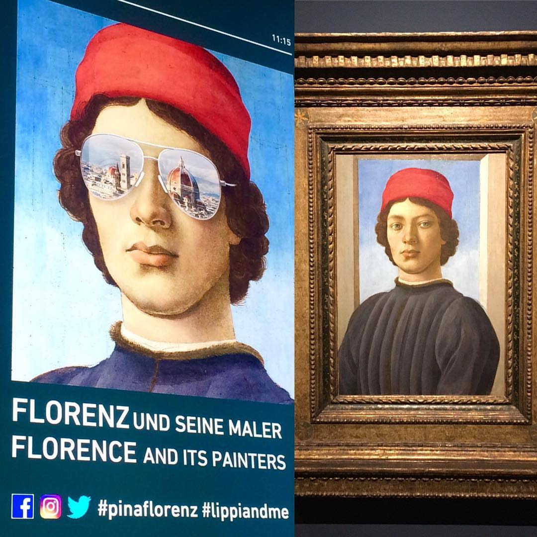 If it would not look so catty, temptation would be great to call the exhibition poster based on Filippino Lippi’s above Portrait of a young Man (c.1480-1485) the best thing of the current show ( (“Florence and its Painters”) on Florentine art in Munich’s Alte Pinakothek. The young man in question (Fig. 1 above) looks stylish and rather full of himself; he might turn round and dash off to the nearest fashionable bar for his daily prosecchino and a chat with his friends. We have all seen the type in cities of a certain life-style such as Florence, Milan or Munich. On the poster, this young man wears a pair of up-to-date mirrored sunglasses which reflect the cityscape of downtown Florence. Thus the advertisement makes an important statement: Florence as the renaissance city of artistic innovation was peopled by men and women like you and me. We are as Florentine as the quattrocento patrons, audience and creators of Florentine art.